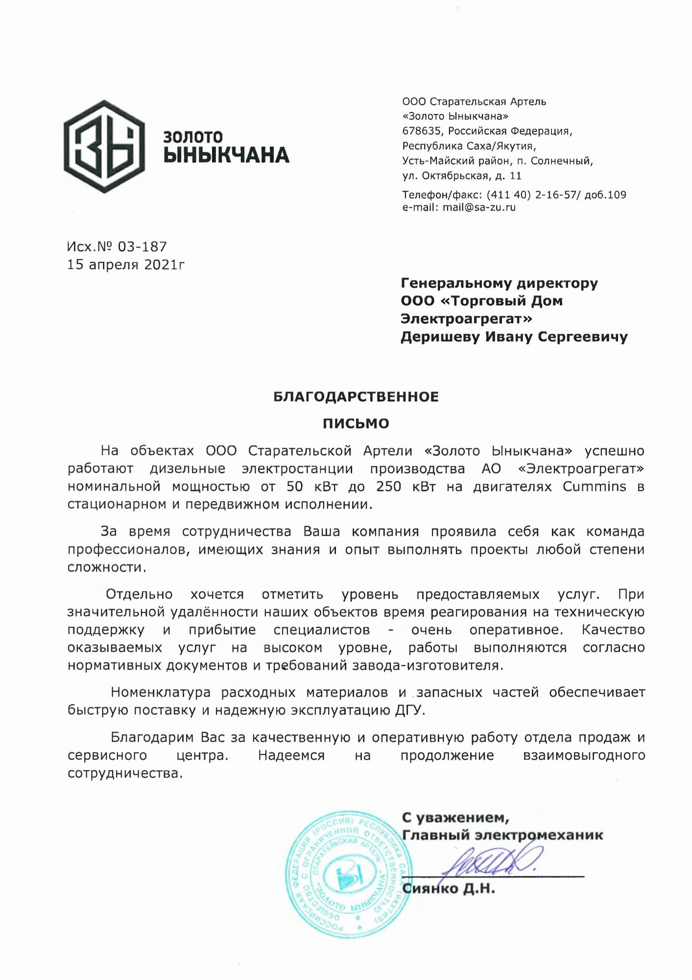 [ALT] => Отзыв контрагентов о компании ООО «ТД Электроагрегат» и исполненном проекте для ООО Старательская Артель "Золото Ыныкчана"